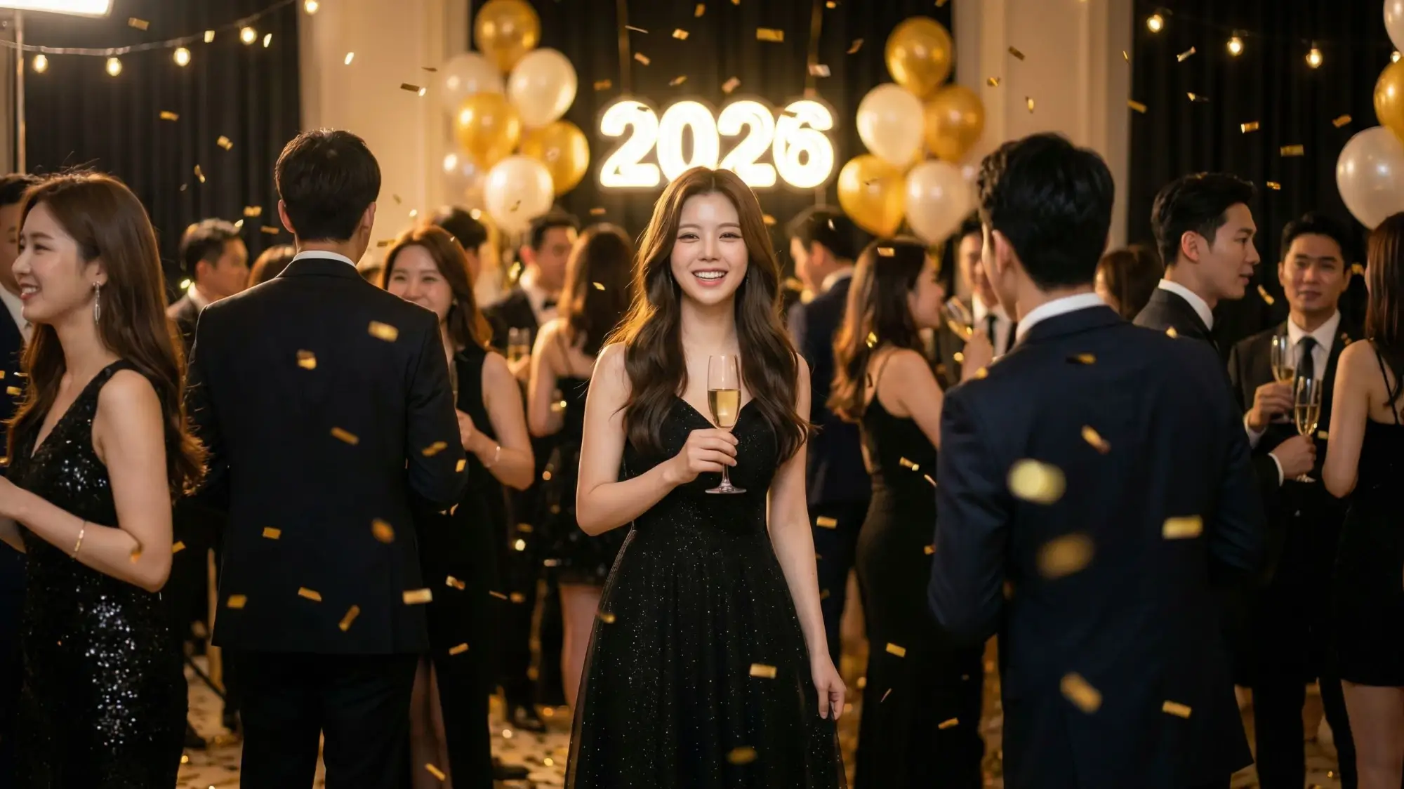 Rita combina de forma inteligente los atuendos de la fiesta de Año Nuevo, los detalles decorativos y los efectos de iluminación para crear una imagen coherente. El sujeto se integra de manera natural con el fondo, evitando recortes evidentes o decoraciones incómodas, lo que hace que el resultado esté listo para compartir o mostrar.