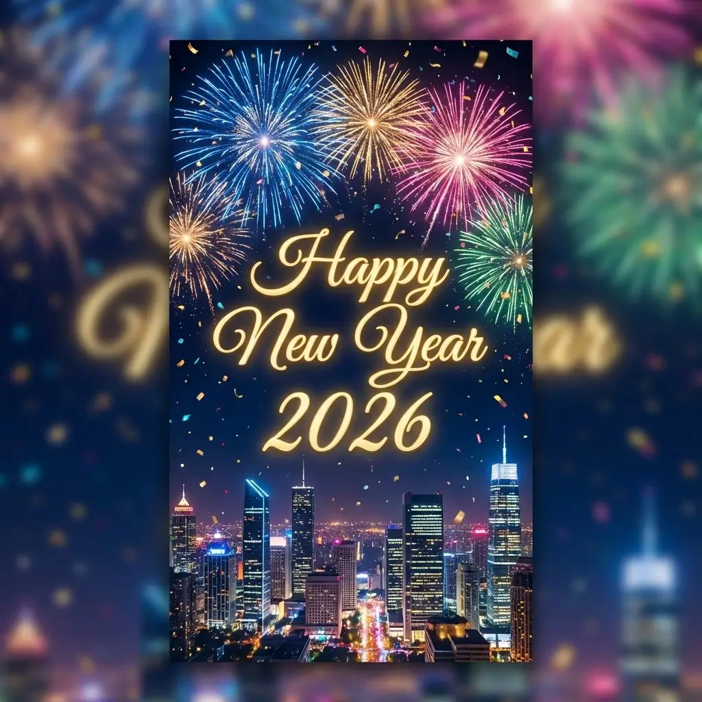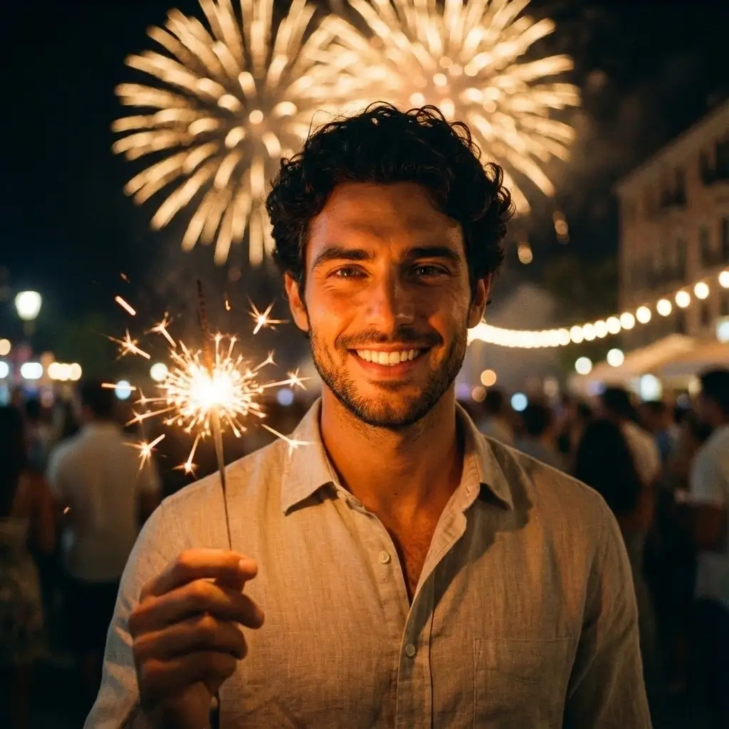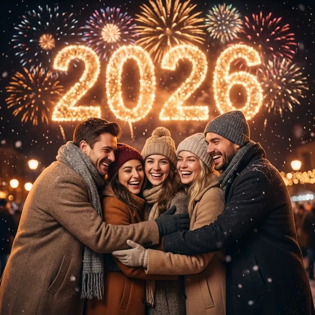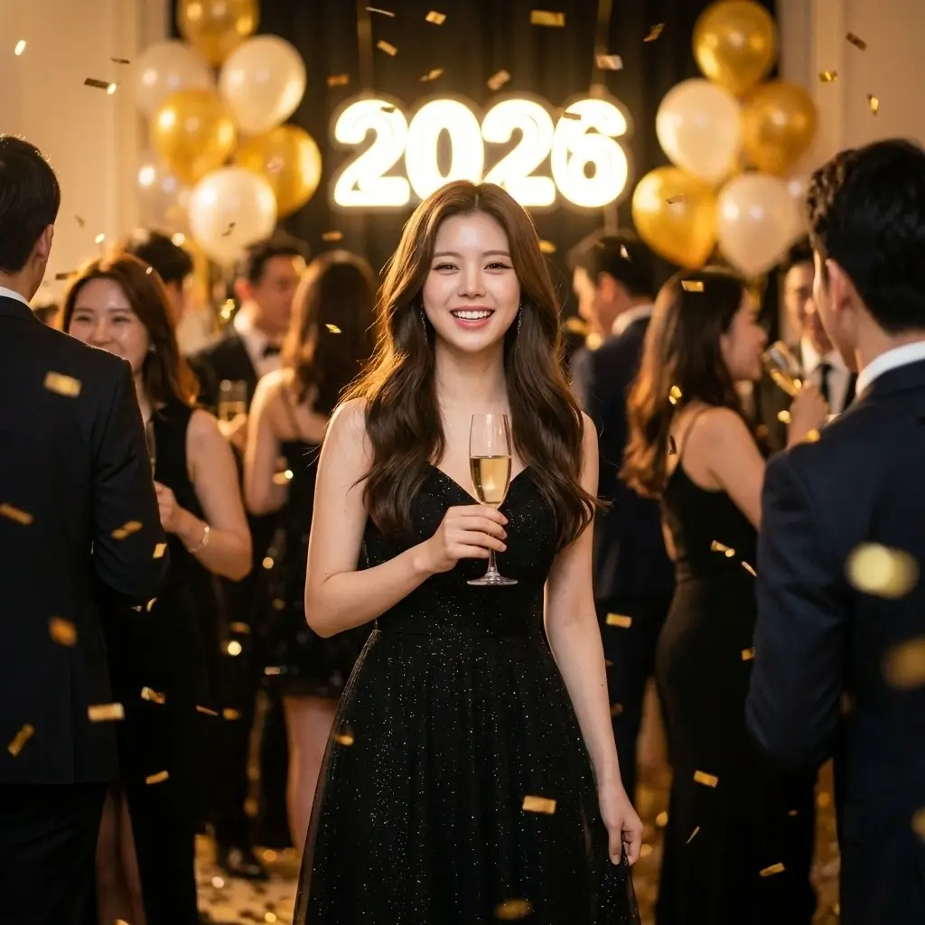 Realistic New Year party portrait, a smiling young person as the main subject, full body shot, centered composition. Wearing an elegant black evening outfit with subtle shimmer, well-fitted and harmonious with the person’s image. Natural makeup, soft glowing skin. Standing with an elegant and relaxed posture, holding a champagne glass naturally. Warm golden lighting illuminating the entire figure. Background with festive New Year decorations, golden and white balloons, confetti in the air, blurred party crowd, glowing “2026” numbers. Shallow depth of field, cinematic lifestyle photography, warm gold and black color palette, joyful and elegant atmosphere, ultra realistic, professional full-body portrait photography